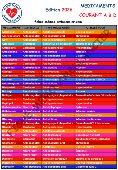 Pensée pour le terrain, cette fiche vous permet d’accéder rapidement aux informations essentielles sur les médicaments courants utilisés en préhospitalier.